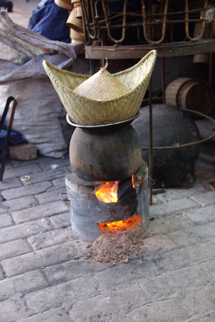 Cooking sticky rice. The rice is in the wicker basket being steamed by water in the pot below.