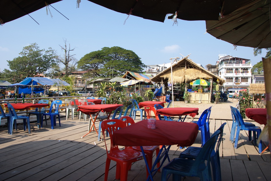 The cook huts were between the street and the seating area. As you walked along the street you could see the menu and fresh ingredients at the cook huts before deciding to eat there.
