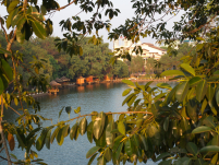 I stayed in a hotel on a small lake surrounded by a park.